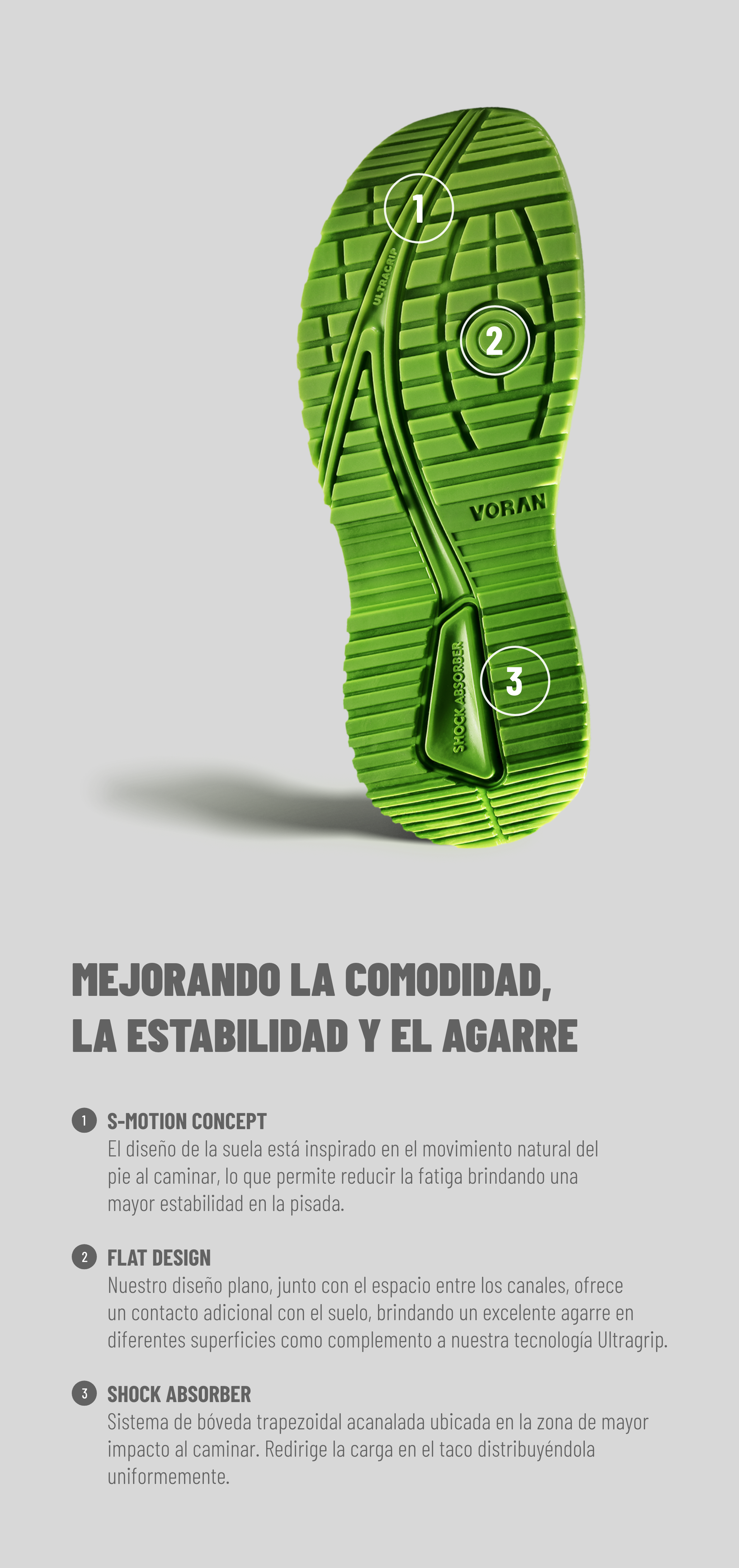 El diseño de la suela está inspirado en el movimiento natural del pie al caminar, lo que permite reducir la fatiga