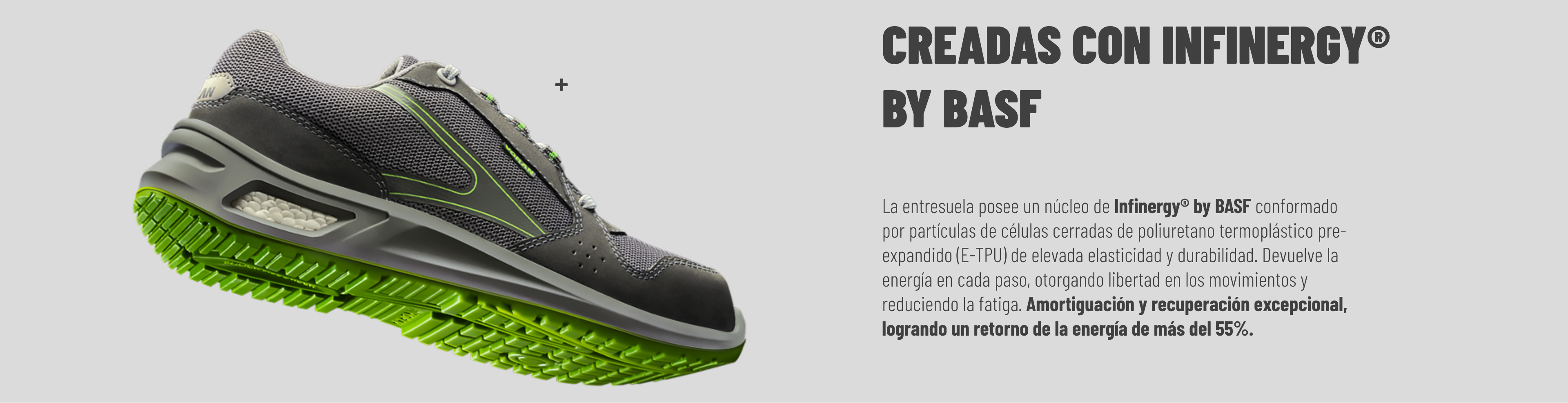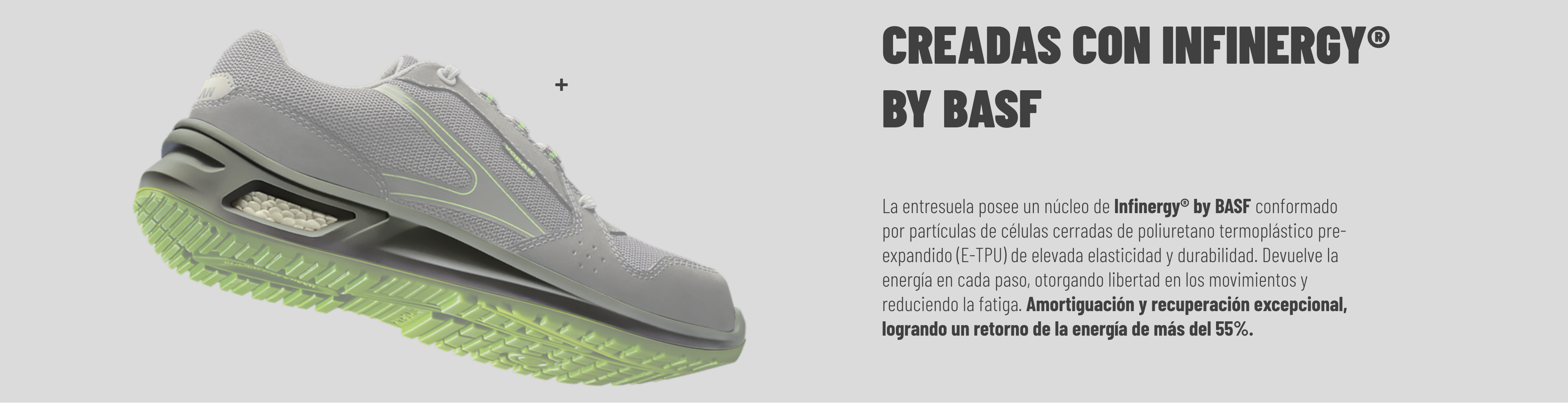 Nuestras entresuelas de Infinergy® by BASF poseen un centro de partículas de poliuretano termoplástico expandido (E-TPU) de células cerradas que tienen alta elasticidad y durabilidad. Con más del 55 % de retorno de energía en cada paso, una recuperación y una amortiguación excepcionales, proporciona libertad de movimiento adicional y reduce la fatiga.