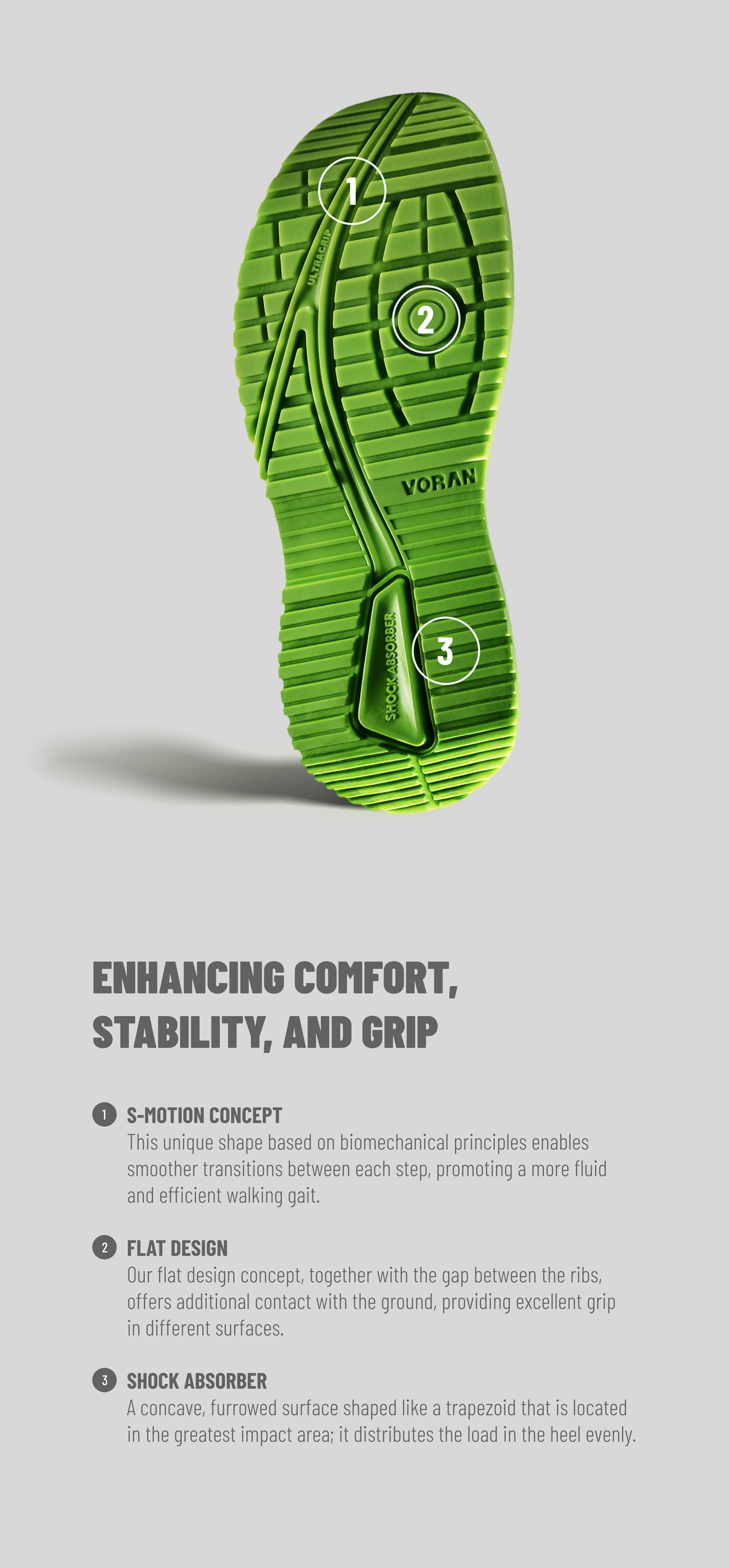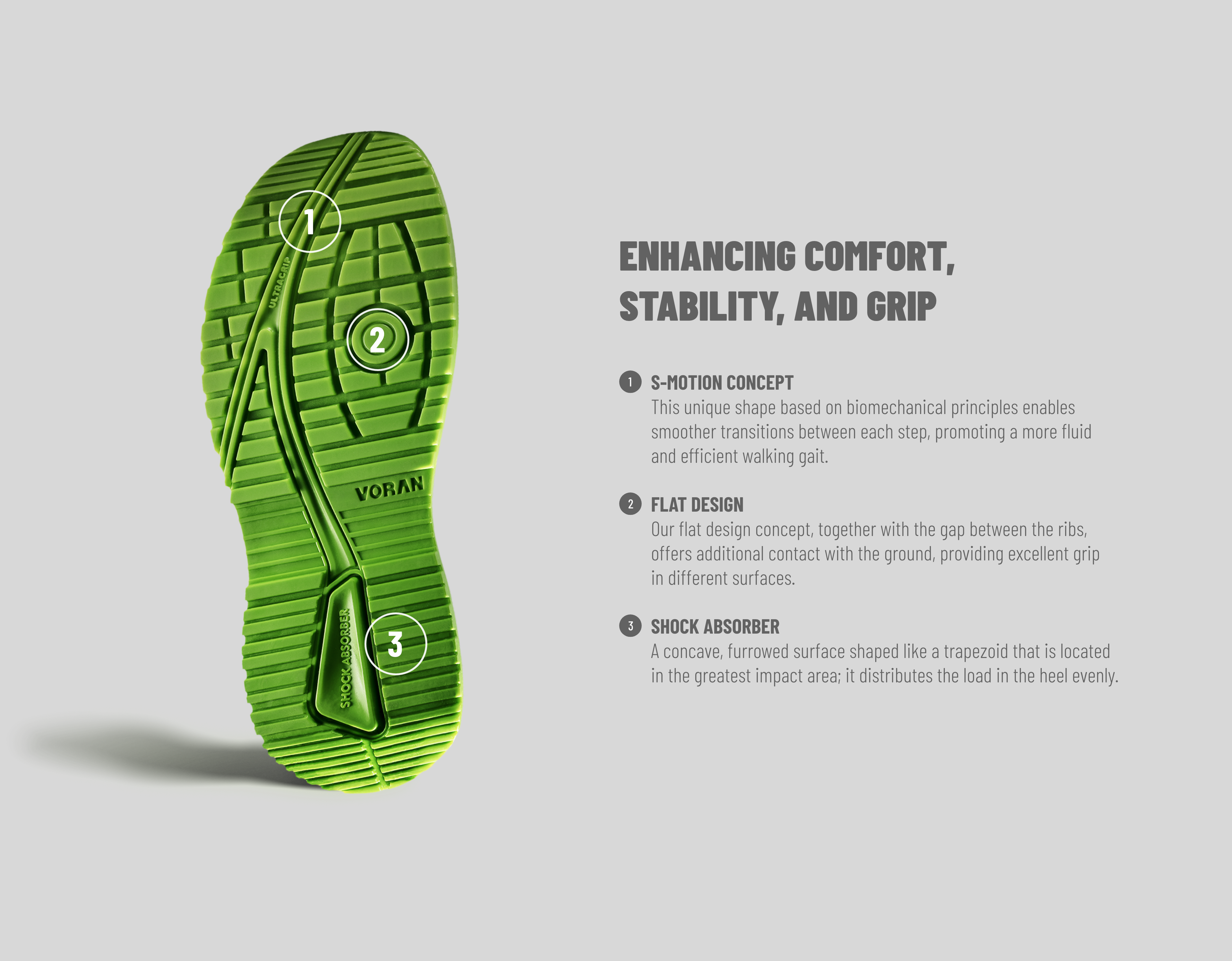 Our sole design is inspired by the foot’s natural movement when walking, allowing to considerably reduce fatigue